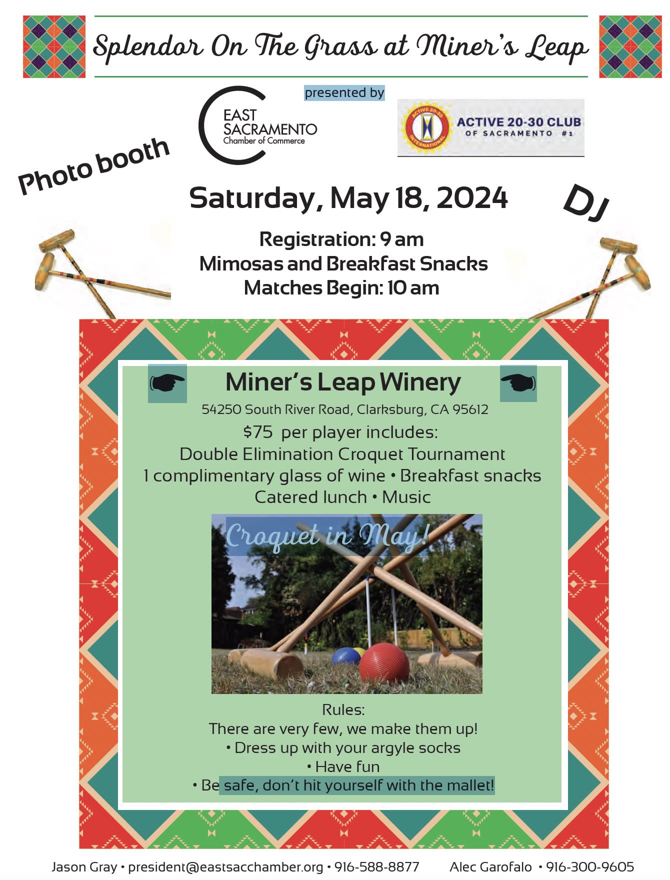 ** Canceled ** Come out for a fun day of croquet on the beautiful grounds of Miners Leap Winery. Event benefits the Sacramento #1 2030 Club and the East Sacramento Chamber of Commerce. Participants get an entry, mimosa, breakfast snacks, minimum of 2 matches, a glass of Miners Leap Wine, Catered lunch and a bunch of new friends. There will be a DJ and a photobooth.